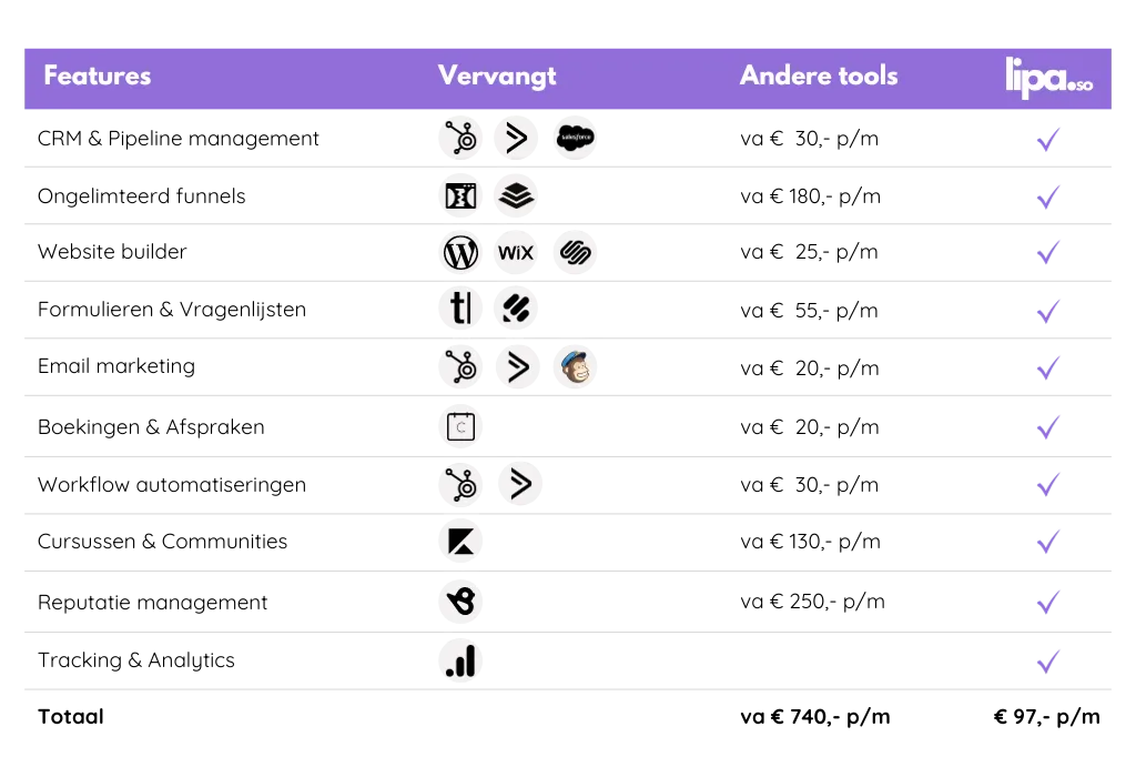 Geen zorgen meer over je website, funnels, de presentatie van je aanbod, het koppelen van de juiste tools of afhandelen van alle leads of afspraken die binnenkomen. Binnen LIPA.so combineer je al jouw online marketing en automatiseer je alle processen.